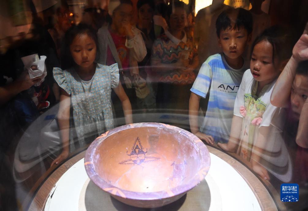 參觀(guān)者在西安半坡博物館里觀(guān)看人面網(wǎng)紋彩陶盆(8月9日攝)。