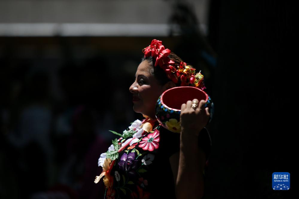 8月9日,在墨西哥首都墨西哥城,演員身著(zhù)傳統服飾參加世界土著(zhù)人民國際日慶?;顒?dòng)。