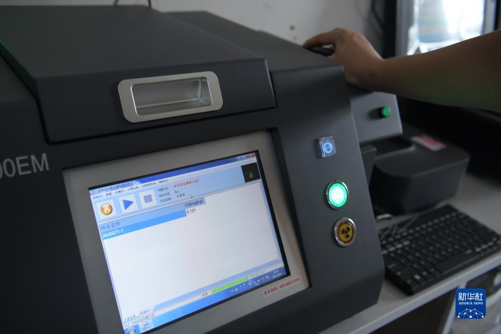 在江西省南昌縣橫崗國家糧食儲備庫,工作人員通過(guò)設備檢測抽樣糧食的水分、品質(zhì)、農藥殘余、重金屬等情況(8月8日攝)。
