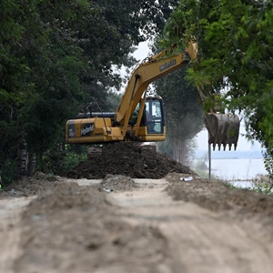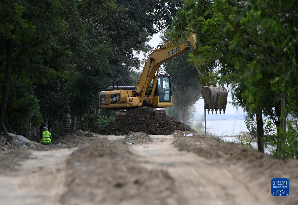 8月10日,在天津市靜海區大清河臺頭段南堤,工程機械設備在堤壩上作業(yè)。
