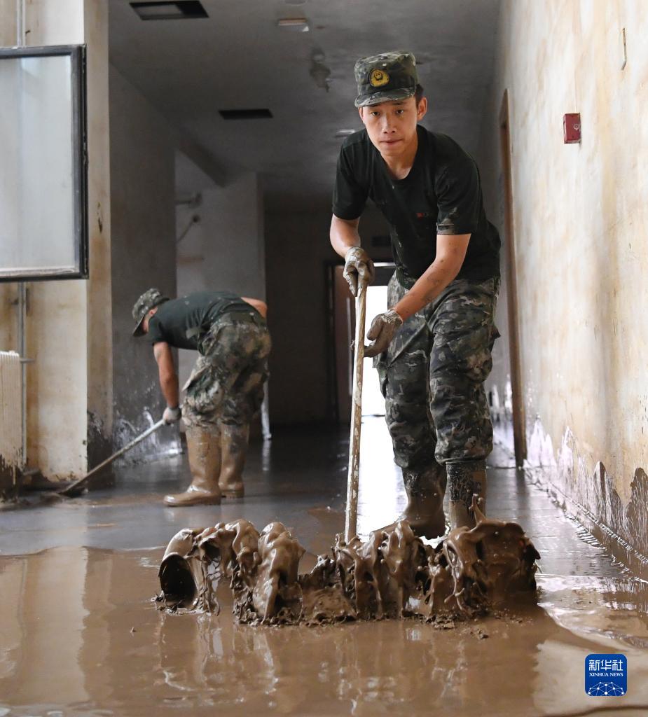8月10日,武警河北總隊保定支隊戰士在涿州中學(xué)教學(xué)樓清淤。