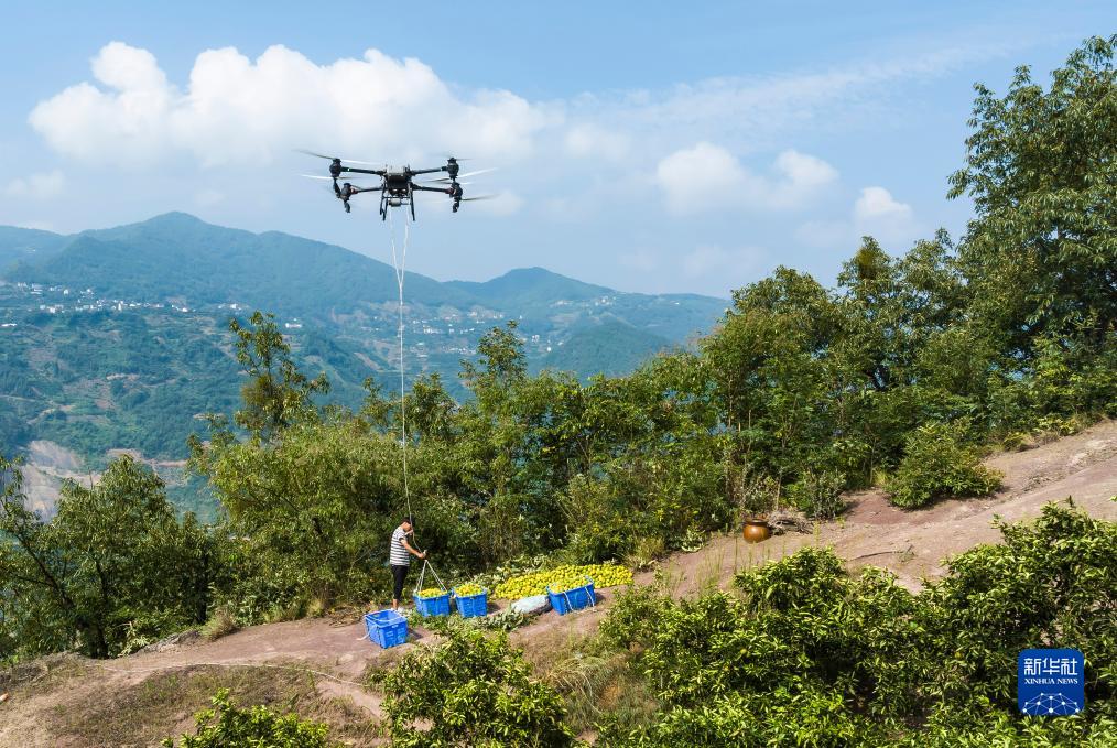 8月10日,技術(shù)人員在秭歸縣泄灘鄉坊家山村用無(wú)人機幫村民轉運柑橘(無(wú)人機照片)。