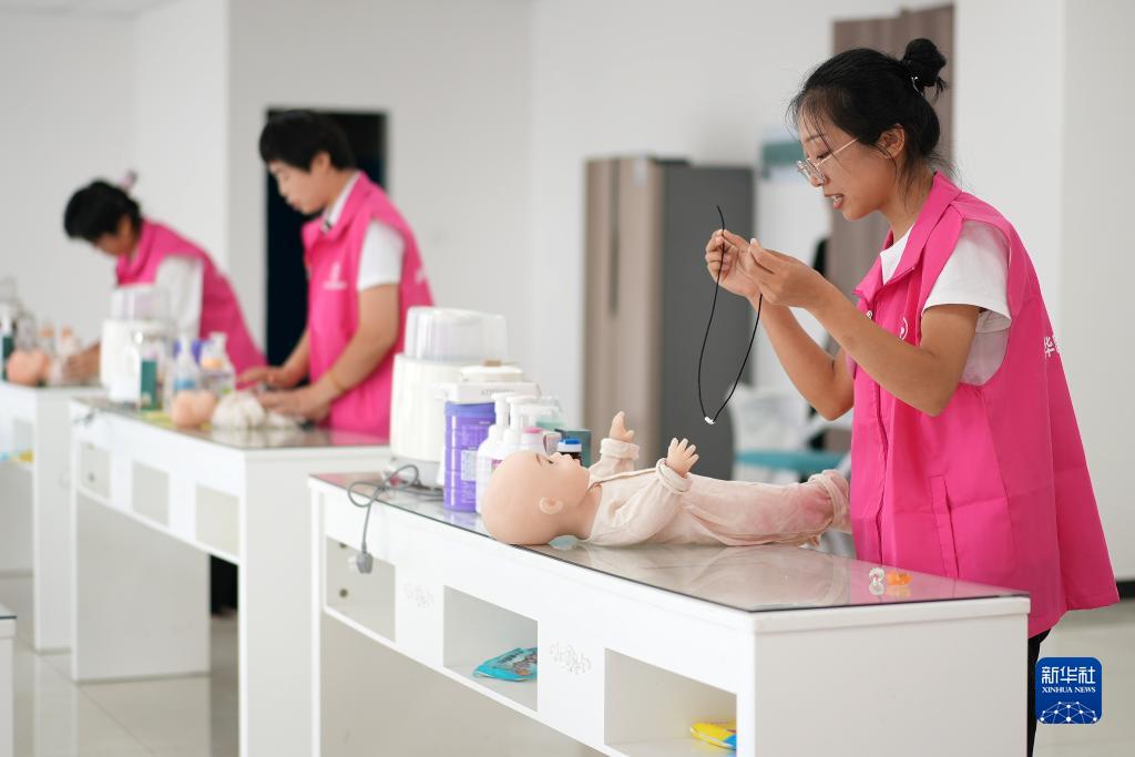 8月11日,在河北省滄州市新華區巾幗家政服務(wù)技能大賽比賽現場(chǎng),參賽人員展示育嬰技能。