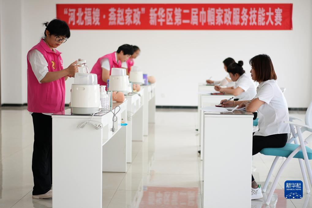 8月11日,在河北省滄州市新華區巾幗家政服務(wù)技能大賽比賽現場(chǎng),參賽人員展示育嬰技能。