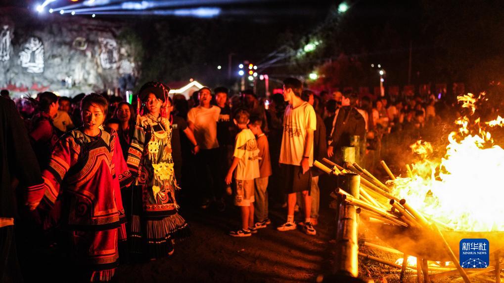 當地群眾和外地游客在篝火旁歡慶火把節(8月10日攝)。
