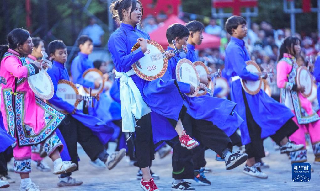 小朋友在威寧彝族回族苗族自治縣火把節活動(dòng)上表演月琴舞(8月10日攝)。