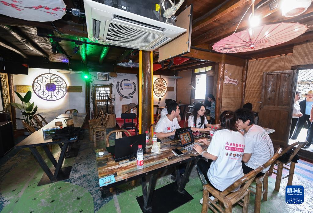 8月11日,高校藝術(shù)院系的大學(xué)生們在葛家村的特色酒吧內討論村落藝術(shù)改造提升的設計方案。
