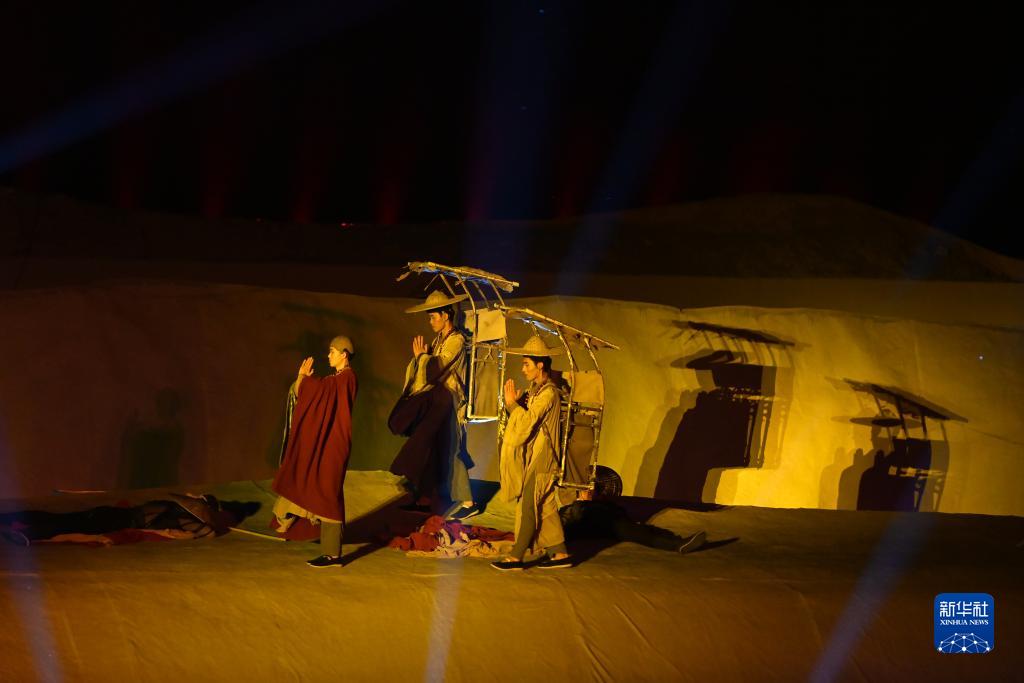 今年以來(lái),脫胎于敦煌文化的洞窟沉浸式體驗劇《樂(lè )動(dòng)敦煌》、室內情景體驗劇《又見(jiàn)敦煌》、沙漠實(shí)景演出《敦煌盛典》和中國殘疾人藝術(shù)團情景音畫(huà)劇《千手千眼》四場(chǎng)劇目在絲路名城甘肅敦煌同步上演,劇目將敦煌歷史底蘊、服飾文化、樂(lè )舞文化等生動(dòng)融合,為游客呈現出精彩絕倫的敦煌文化視覺(jué)盛宴,深受中外游客喜愛(ài)。截至8月10日,四大劇目今年已累計演出1175場(chǎng)次,觀(guān)看游客突破66萬(wàn)人次。其中,《敦煌盛典》以敦煌鳴沙山月牙泉為背景,將沙漠景觀(guān)與現代舞美結合,將墻體燈光融入實(shí)景演出,講述了一段發(fā)生在古絲綢之路重鎮敦煌的愛(ài)情故事,展示了敦煌的歷史文化及人文風(fēng)貌。