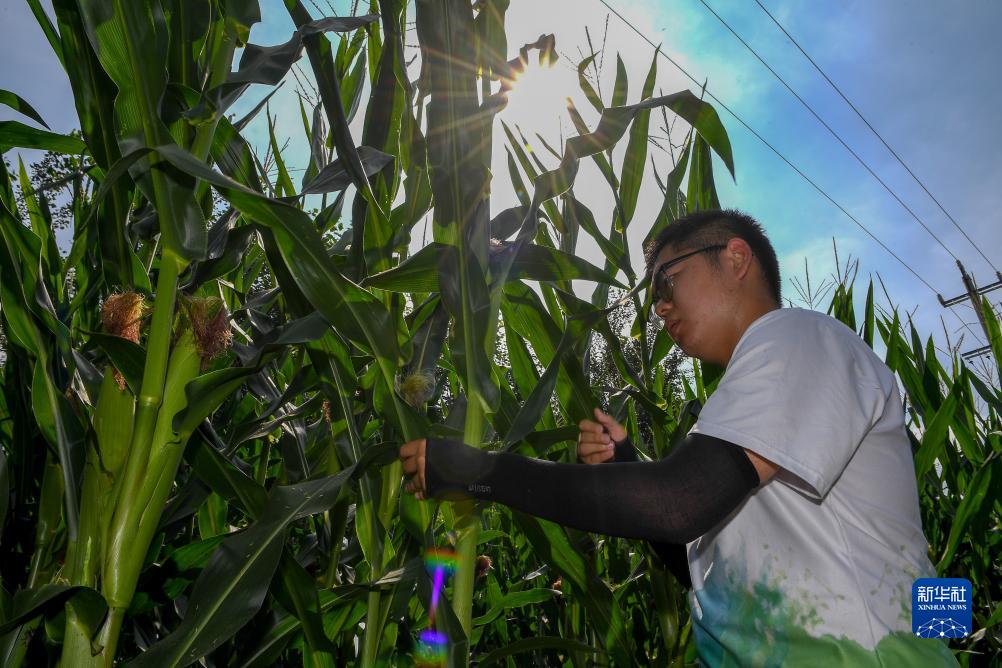 7月31日,在位于吉林省四平市梨樹(shù)縣的中國農業(yè)大學(xué)“科技小院”試驗田,在讀碩士生蔣家偉查看作物生長(cháng)情況。