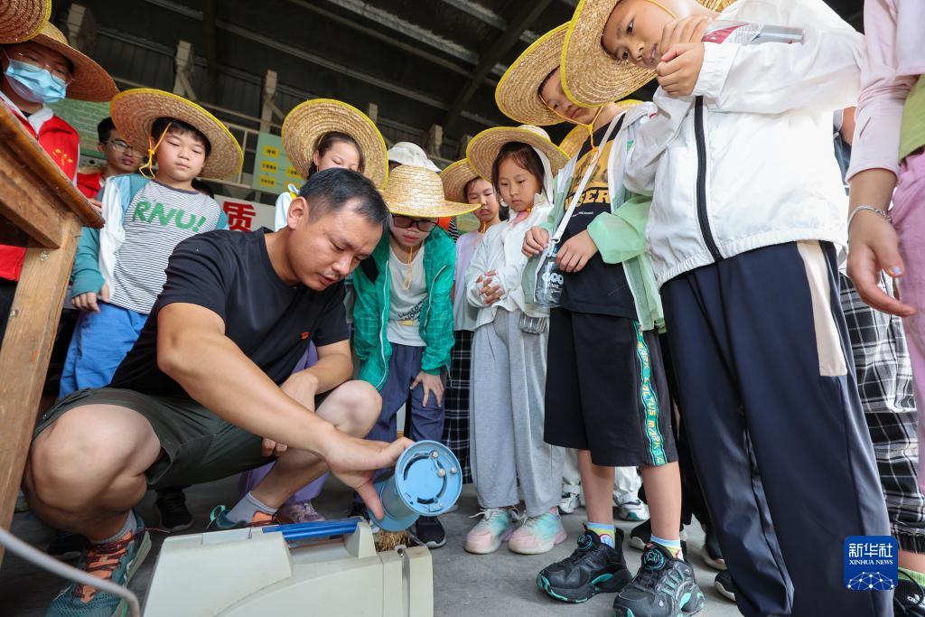 8月11日,在吳興區道場(chǎng)鄉錢(qián)山下糧油專(zhuān)業(yè)合作社,小朋友在了解糙米的形成。