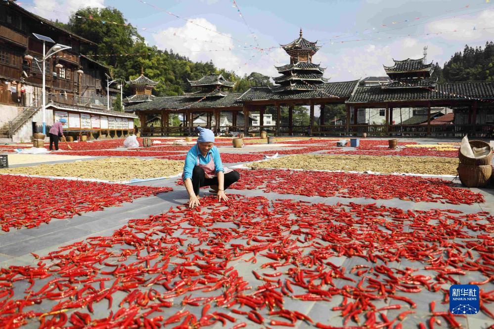 8月11日,在貴州省黔東南苗族侗族自治州錦屏縣大同鄉秀洞村,村民在晾曬辣椒。