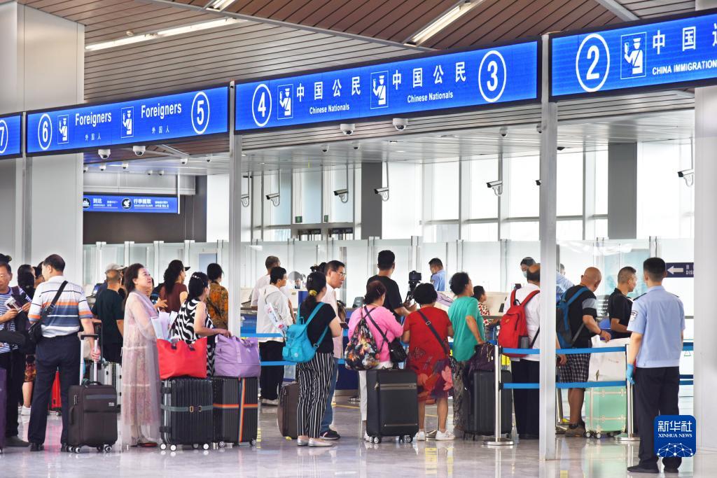 8月11日,旅客在青島郵輪母港客運碼頭排隊辦理邊檢出境手續。