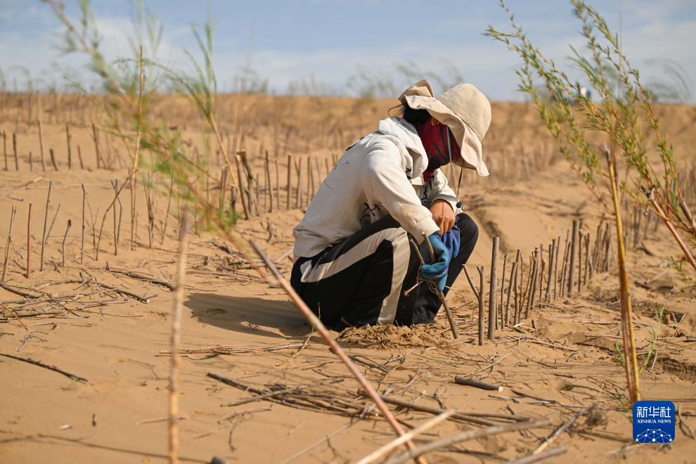 8月11日,工人在達拉特旗境內的庫布其沙漠中栽設沙障。