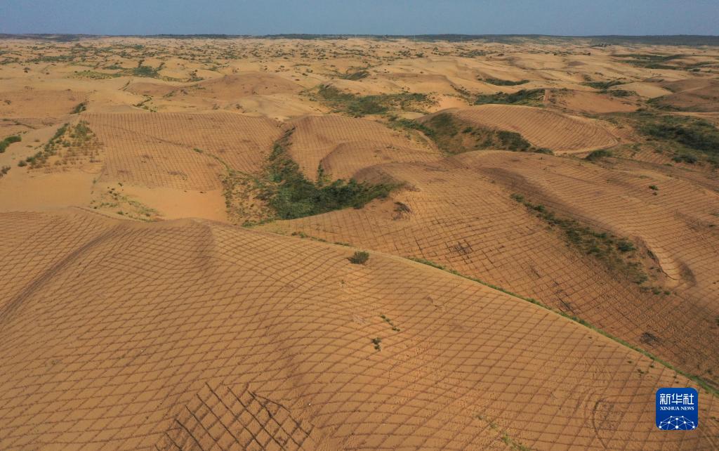 這是8月11日拍攝的達拉特旗境內的庫布其沙漠中的沙障(無(wú)人機照片)。