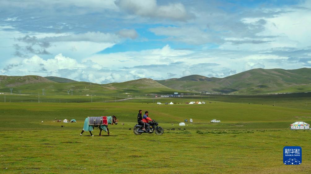 8月11日,馴馬人騎摩托車(chē)在羌塘草原上遛馬。