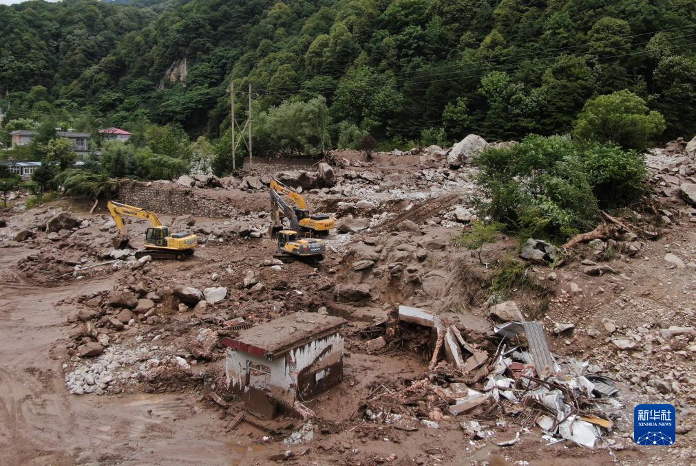 這是8月12日拍攝的西安市長(cháng)安區灤鎮街道喂子坪村雞窩子組山洪泥石流災害現場(chǎng)(無(wú)人機照片)。
