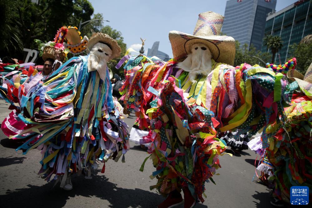 8月9日,在墨西哥首都墨西哥城,演員身著(zhù)傳統服飾參加世界土著(zhù)人民國際日慶?;顒?dòng)。