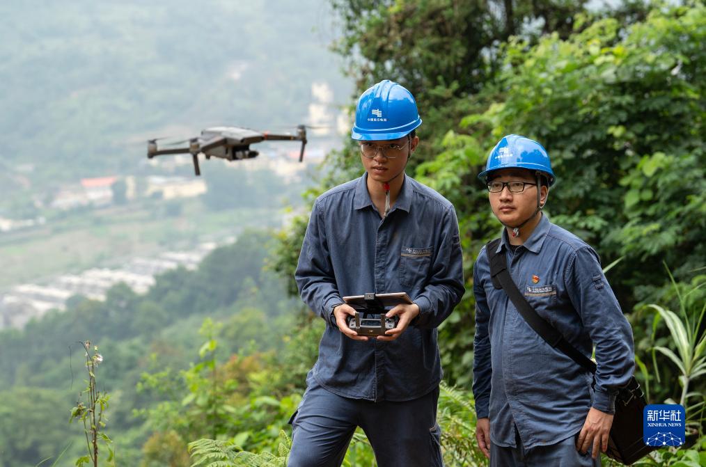 8月10日,姚證強(右)和李英興操作無(wú)人機巡視線(xiàn)路和設備。新華社記者 費茂華 攝