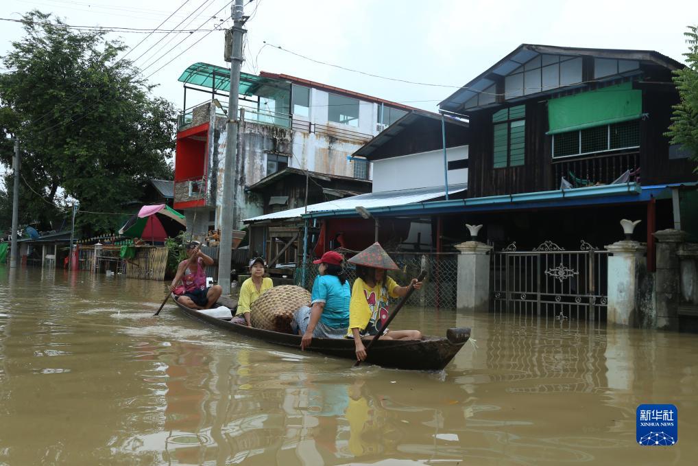 8月12日,在緬甸勃固鎮洪災區,人們乘船出行。新華社發(fā)(苗覺(jué)梭攝)