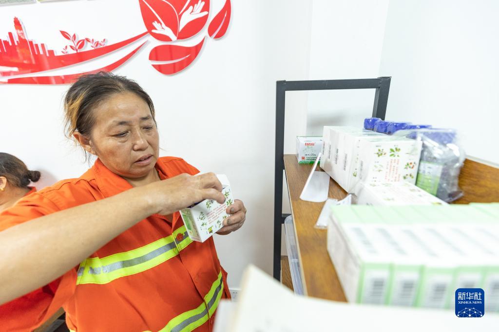 8月12日,在重慶市沙坪壩區壯志路“勞動(dòng)者港灣”,環(huán)衛工人在拿清涼解暑藥品。