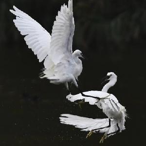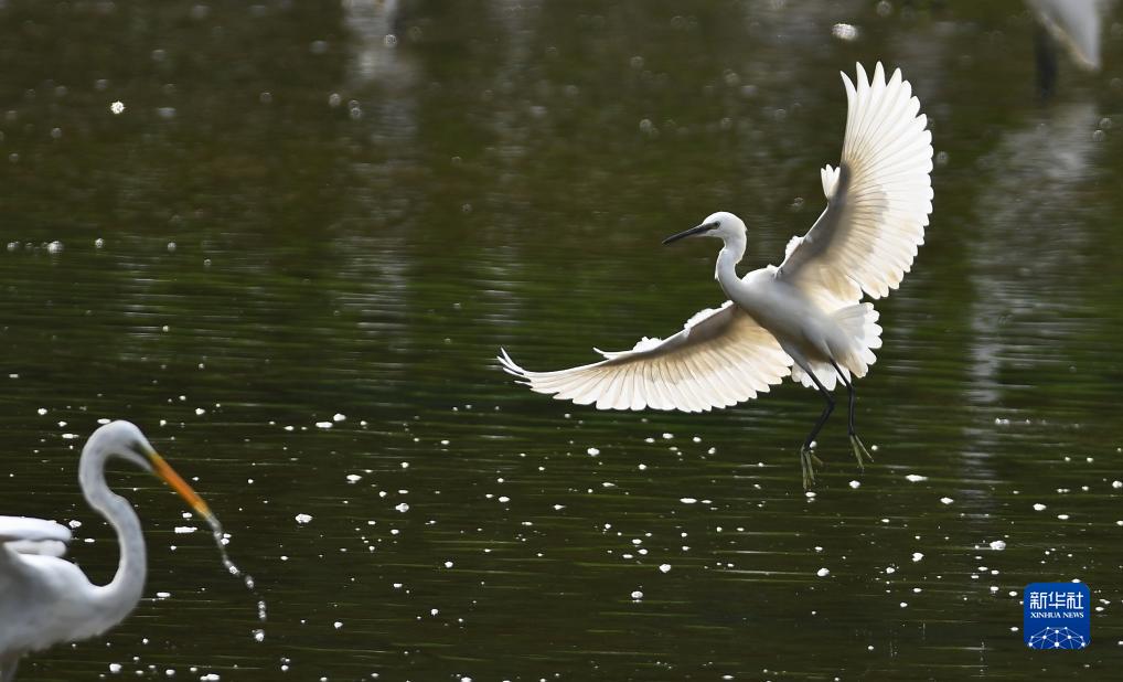 近日,成群的白鷺在山東省滕州市荊河水域覓食、飛舞。