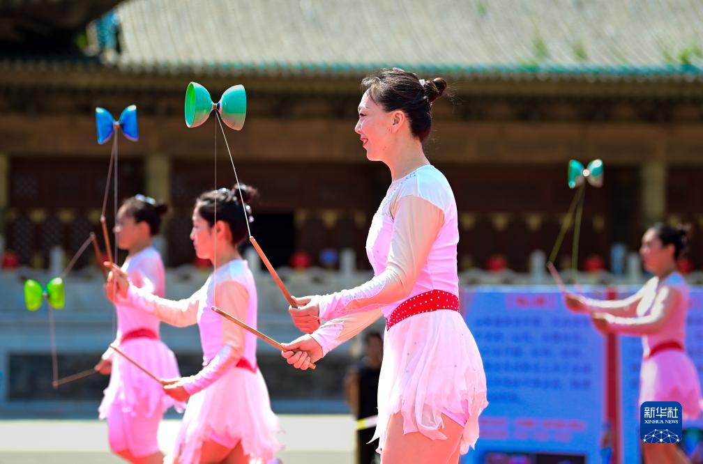 8月13日,在鄂爾多斯文化產(chǎn)業(yè)園景區,民間藝人表演雜技《俏花旦》。