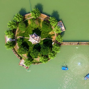 8月13日,在浙江省湖州市長(cháng)興縣和平鎮橫山村,工作人員乘船打撈水面漂浮物(無(wú)人機照片)。