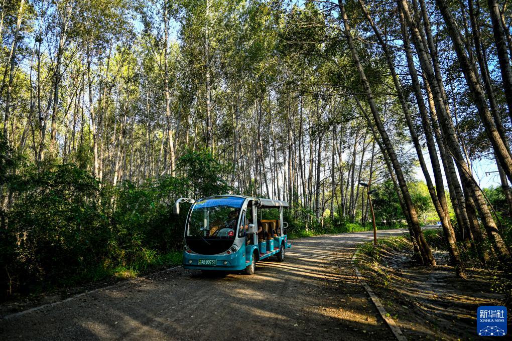 8月13日,游人乘坐電瓶車(chē)欣賞洮兒河國家濕地公園景色。