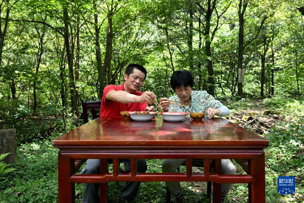 8月12日,在安徽天馬國家級自然保護區天堂寨管理站的一處管護站,王克東和高開(kāi)玉在吃飯。每年10月1日至次年4月30日的防火關(guān)鍵期,王克東夫妻倆會(huì )在這里長(cháng)期居住。