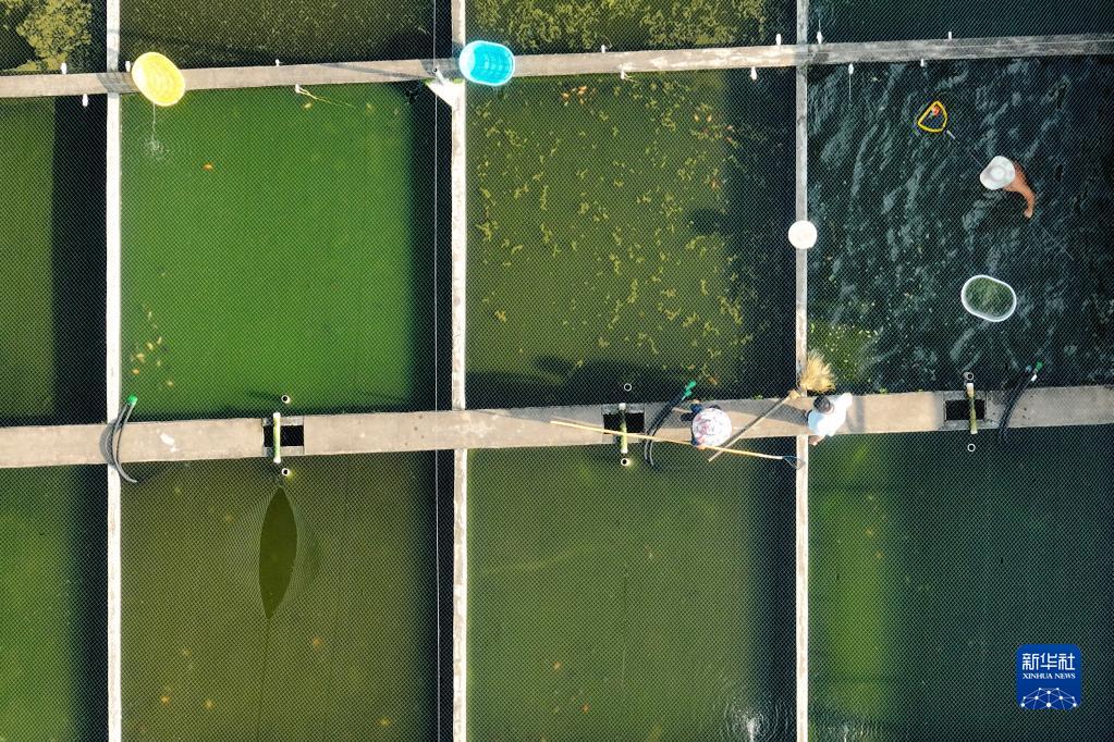 在福州市閩侯縣南通鎮古城村春園鯉生態(tài)養殖場(chǎng),養殖戶(hù)們在養殖池里挑選金魚(yú)(8月9日攝,無(wú)人機照片)。