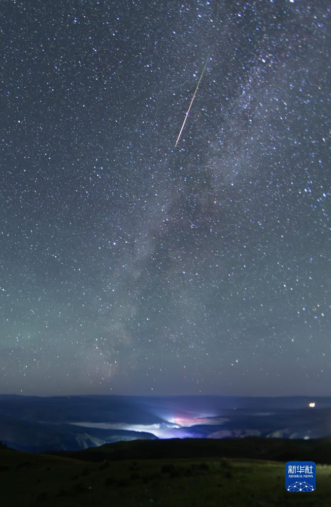 在四川省紅原縣安曲鎮,英仙座流星雨劃過(guò)夜空(8月13日攝)。