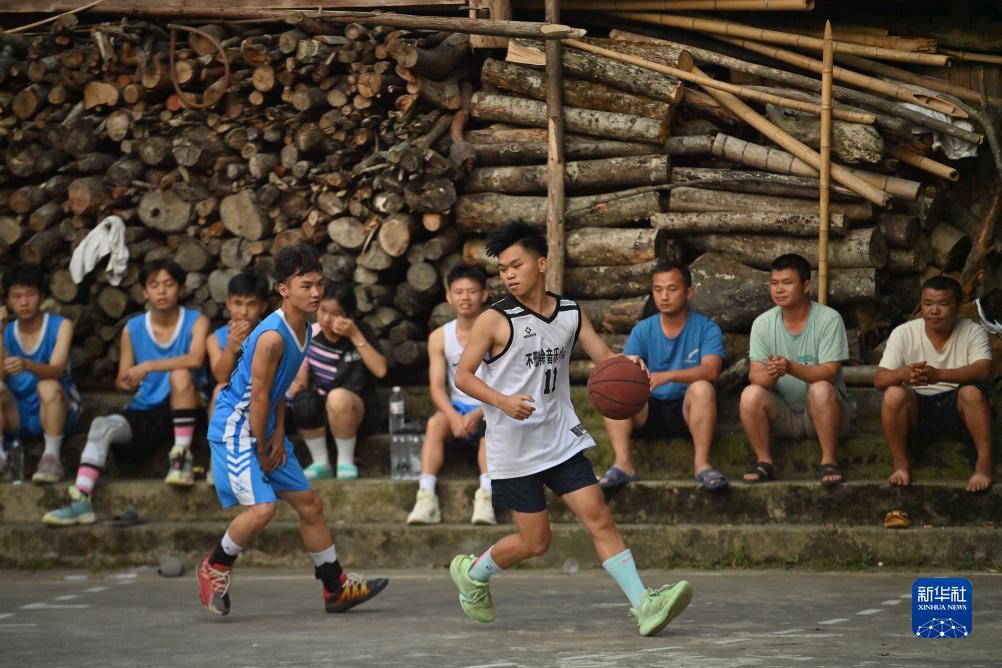 在廣西融水苗族自治縣桿洞鄉堯告村田邊屯籃球場(chǎng),大學(xué)生韋海生(右)在籃球比賽中(7月31日攝)。