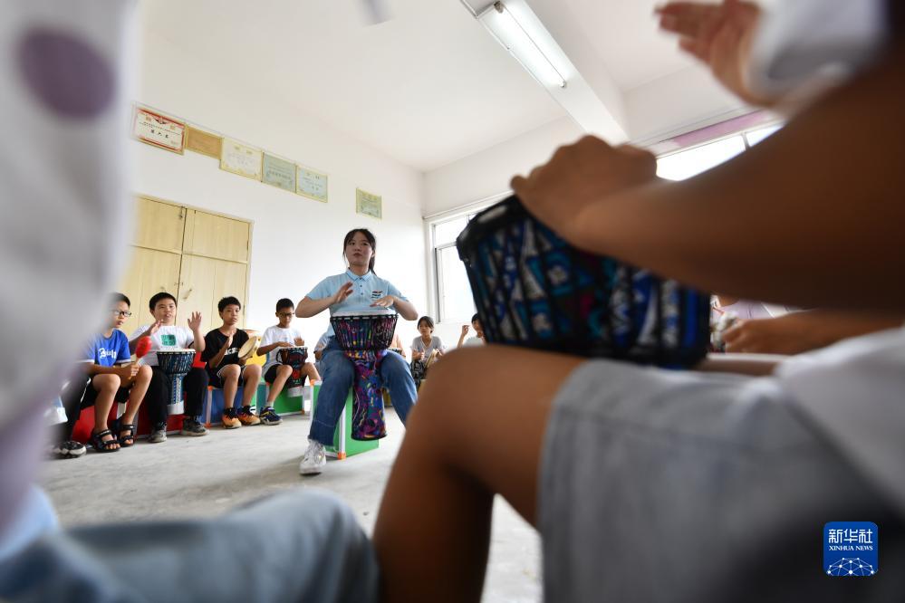 在廣西融安縣泗頂鎮中心小學(xué),廣西科技大學(xué)學(xué)生彭玥婷在音樂(lè )課堂上給小學(xué)生上課(7月18日攝)。