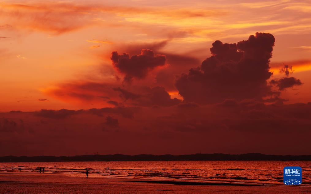 8月14日,游客在金灘上欣賞日出時(shí)的朝霞。