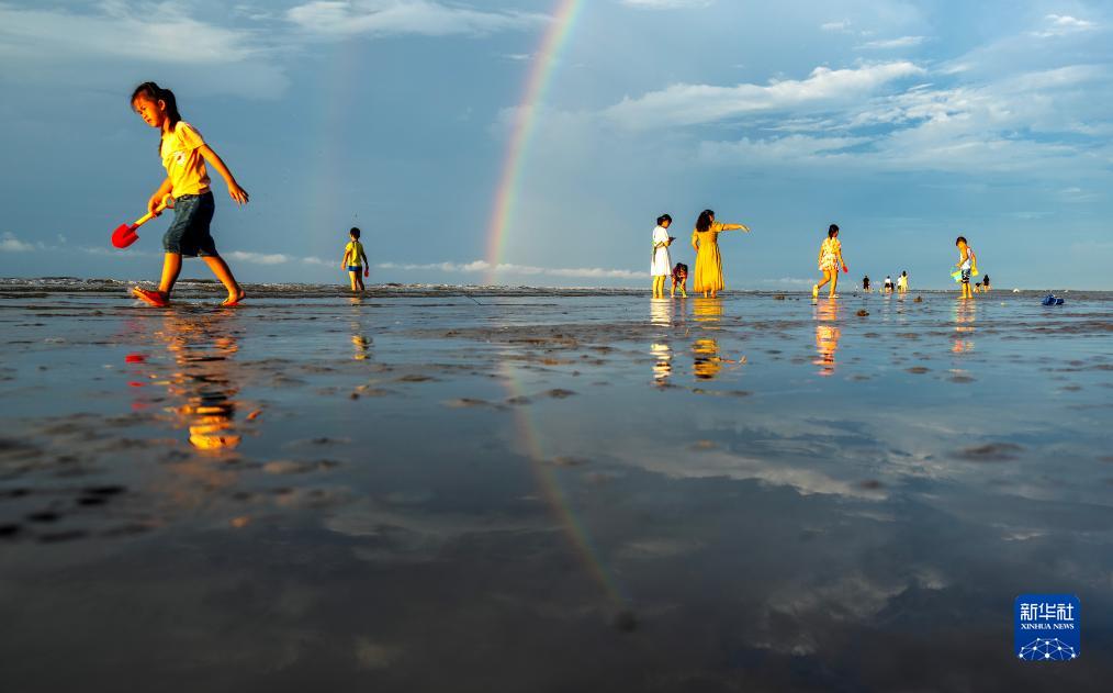 當日,一場(chǎng)晨雨過(guò)后,日出時(shí)分,在廣西東興的金灘,“國道之行 從雪山奔向大?!眻蟮澜M偶遇了朝陽(yáng)與彩虹“共舞”的奇妙景觀(guān)。