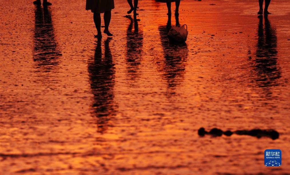 8月14日,游客在金灘上欣賞日出時(shí)的朝霞。