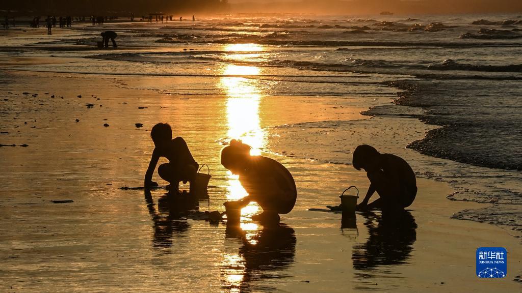 8月14日,日出時(shí)分,游客在金灘游玩。