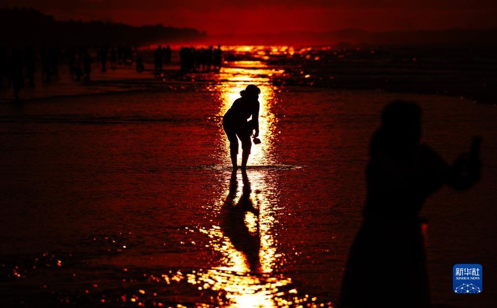 8月14日,游客在金灘上欣賞日出時(shí)的朝霞。