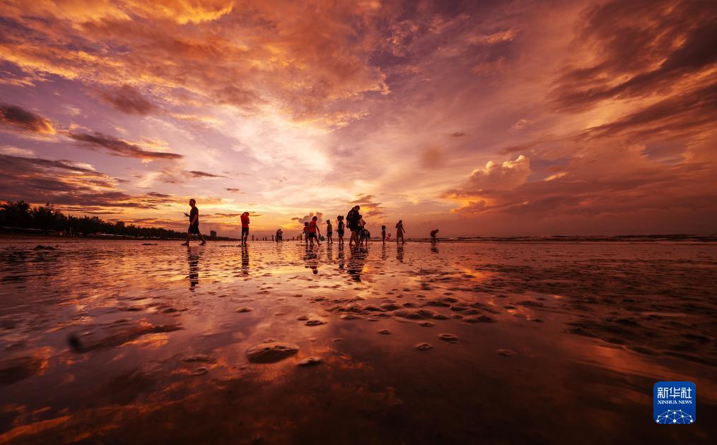 8月14日,游客在金灘上欣賞日出時(shí)的朝霞。