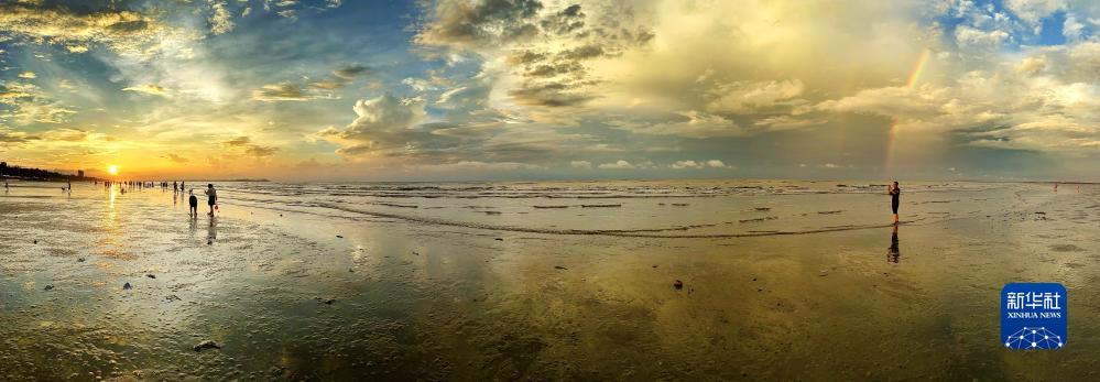 8月14日,日出時(shí)分,游客在金灘出現的彩虹下游玩(手機全景圖片)。