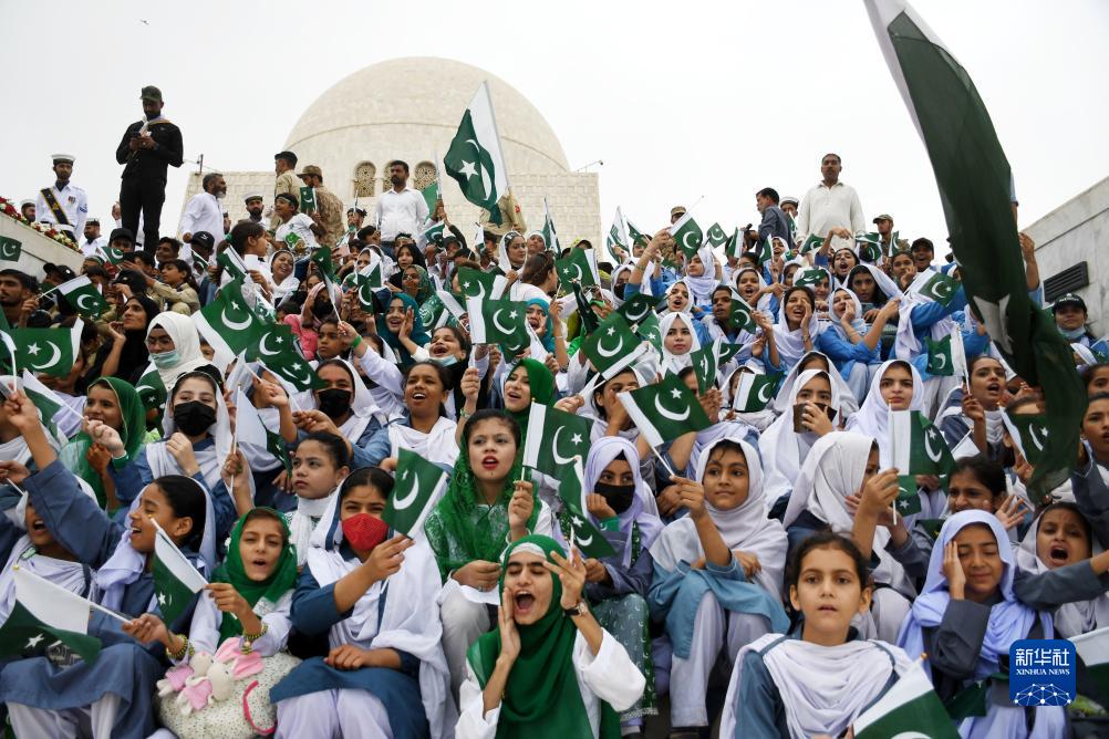 8月14日,在巴基斯坦卡拉奇,當地學(xué)生參加巴基斯坦獨立76周年慶?;顒?dòng)。