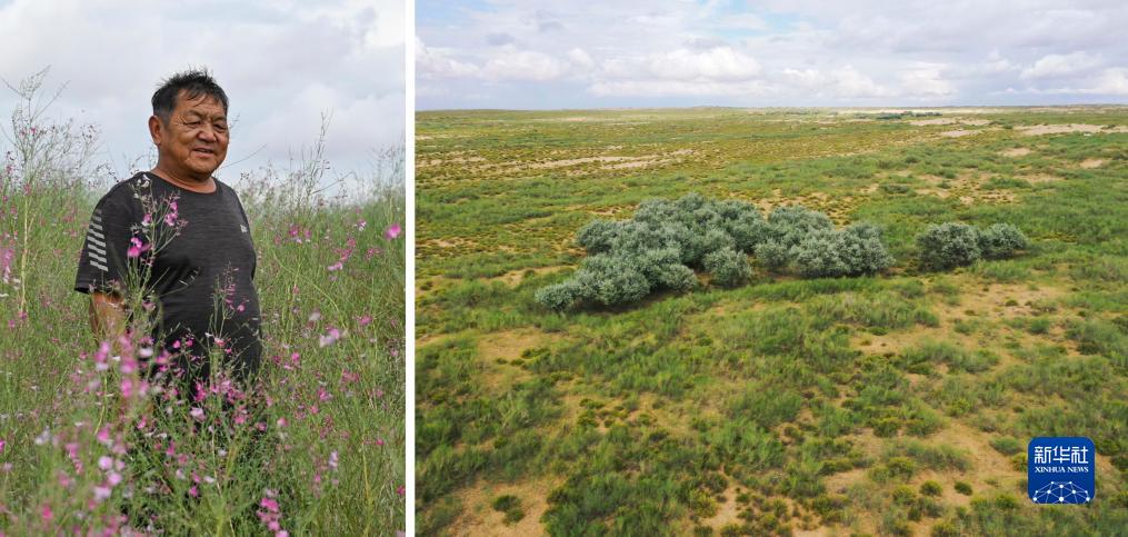 這是一張拼版照片。左圖為內蒙古杭錦旗沙日召嘎查牧民白音道爾計在自家草場(chǎng)的留影(7月21日攝)。右圖為白音道爾計自家草場(chǎng)的現狀(7月21日攝,無(wú)人機照片)。2001年前后,家住庫布其沙漠邊緣的白音道爾計因為草場(chǎng)退化嚴重,開(kāi)始舉債上萬(wàn)元買(mǎi)樹(shù)苗治沙,如今他已將9000多畝沙地變成了綠洲。