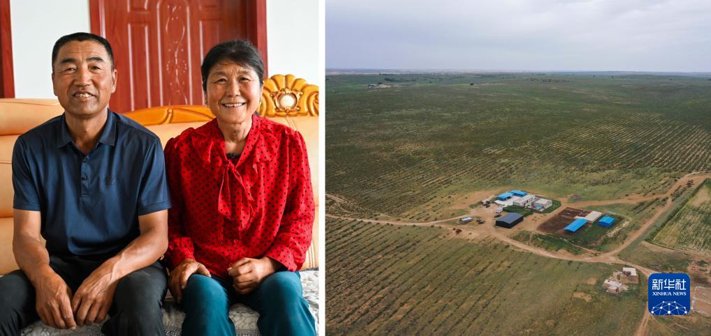這是一張拼版照片。左圖為內蒙古達拉特旗官井村村民周志忠和妻子的合影(8月11日攝);右圖為周志忠位于庫布其沙漠中的房屋(8月11日攝,無(wú)人機照片)。周志忠一家人在庫布其沙漠邊緣擁有8000多畝草場(chǎng)。1998年,周志忠開(kāi)始種植灌木治理沙漠改良草場(chǎng)。