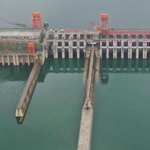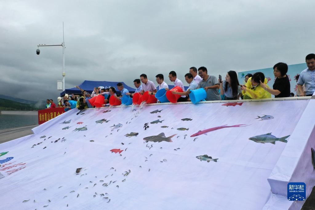 8月15日,在廣西大藤峽水利樞紐工程,工作人員在放流魚(yú)苗(無(wú)人機照片)。