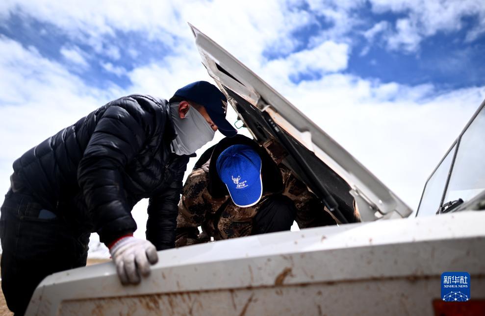 在前往卓乃湖保護站的途中,可可西里管理處卓乃湖保護站隊員才索加(左)和隊友在維修出現故障的車(chē)輛(6月16日攝)。