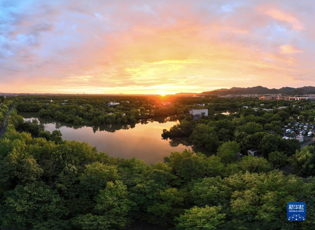 杭州市西溪濕地日出景觀(guān)(7月31日攝,無(wú)人機照片)。