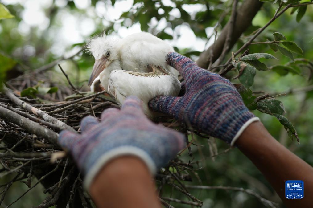寧海灣海島護鳥(niǎo)隊員在一座島上將落巢的白鷺幼鳥(niǎo)放回巢穴(6月13日攝)。浙東寧海灣是重要的鳥(niǎo)類(lèi)棲息地,位于灣區的強蛟鎮組建了由漁民、民警、黨團志愿者等組成的海島護鳥(niǎo)隊,看護這片鳥(niǎo)類(lèi)樂(lè )園。