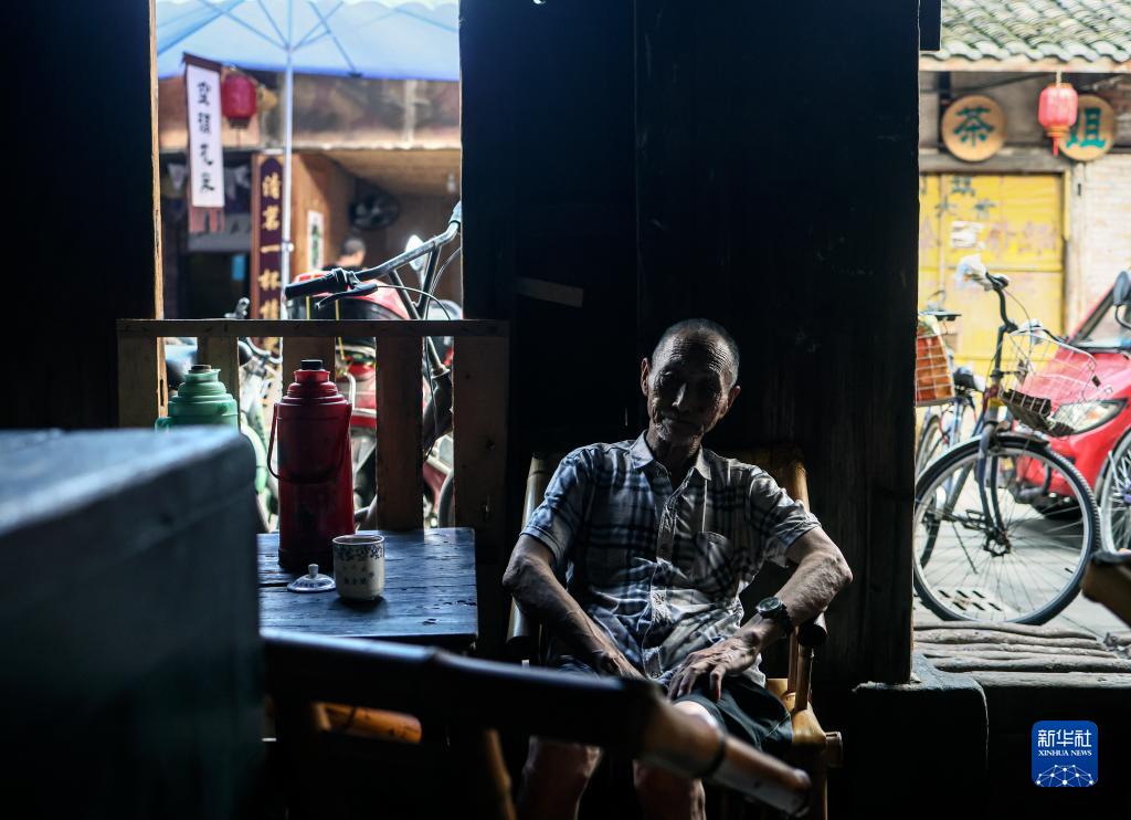 一位喝茶休閑的老人。鎮上的老人都喜歡到觀(guān)音閣老茶館喝茶休閑(8月7日攝)。