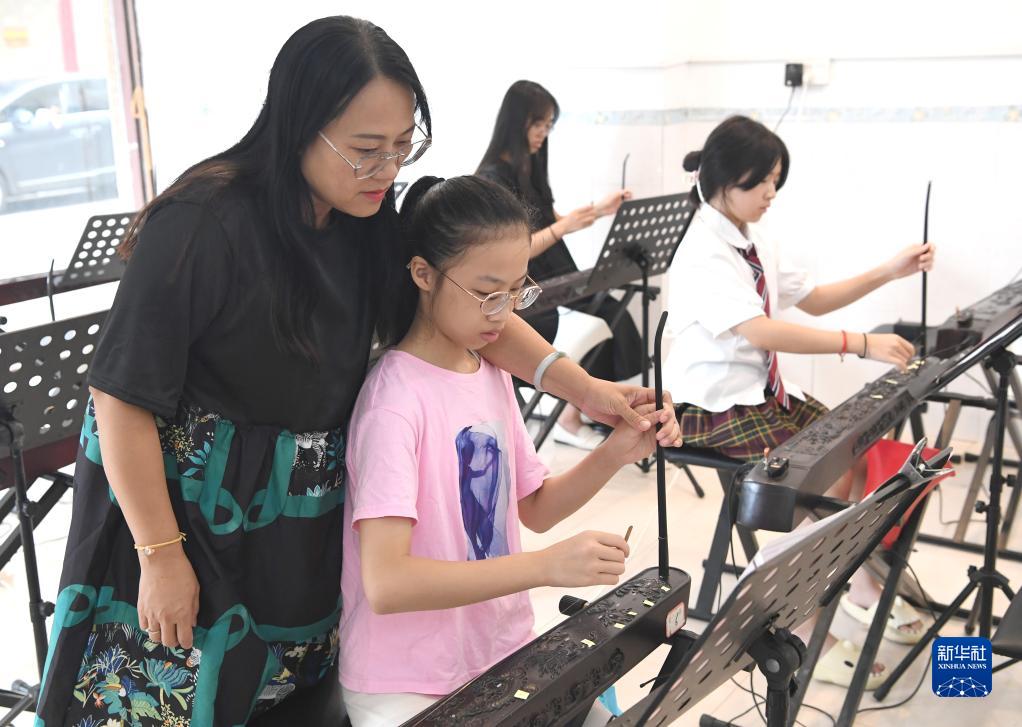 8月13日,東興京族博物館館長(cháng)、獨弦琴傳承人蘇海珍在指導學(xué)生練習。