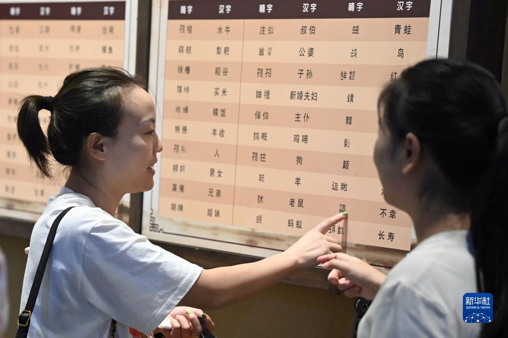 8月13日,在東興京族博物館,一名游客在認識京族文字——喃字。